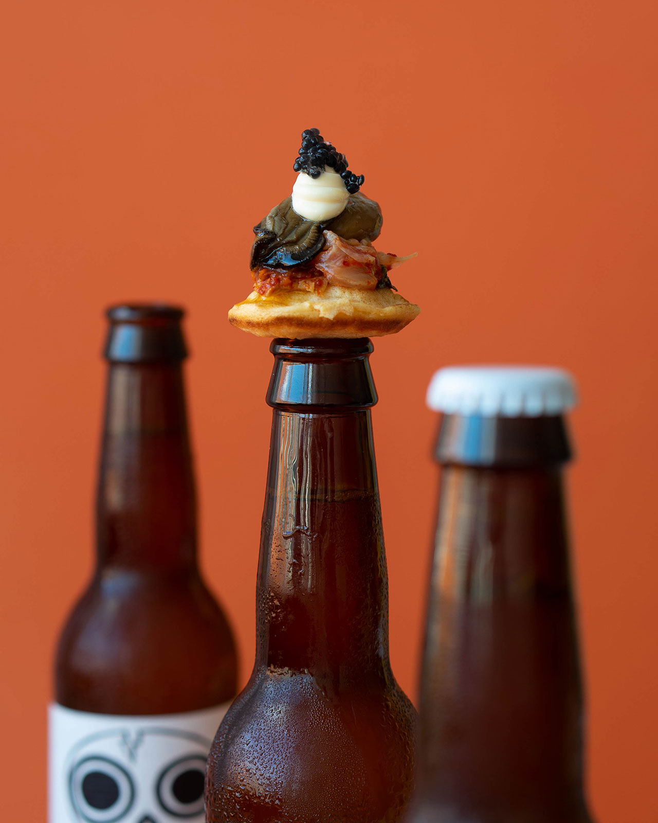 I fell in love with smoked oysters after Suresh recommended them to me and discovered they are now easily available in Holland. I really felt the smokey umaminess of the oysters would go a long way of cutting through the acidity. Then I basically built the remainder of this snack around that. I choose Kewpie to enhance the umami even further and get a bit more grease in. And then finally added carbs to bulk it up, kimchi to add a sour note and imitation caviar for an extra salty punch. Together with Will Sark this is a flavor bonanza for your taste buds.
