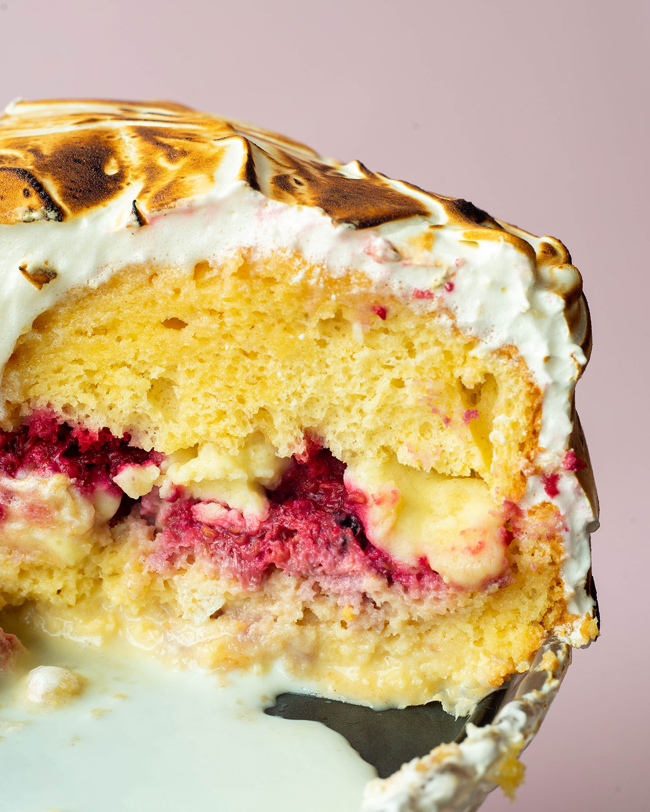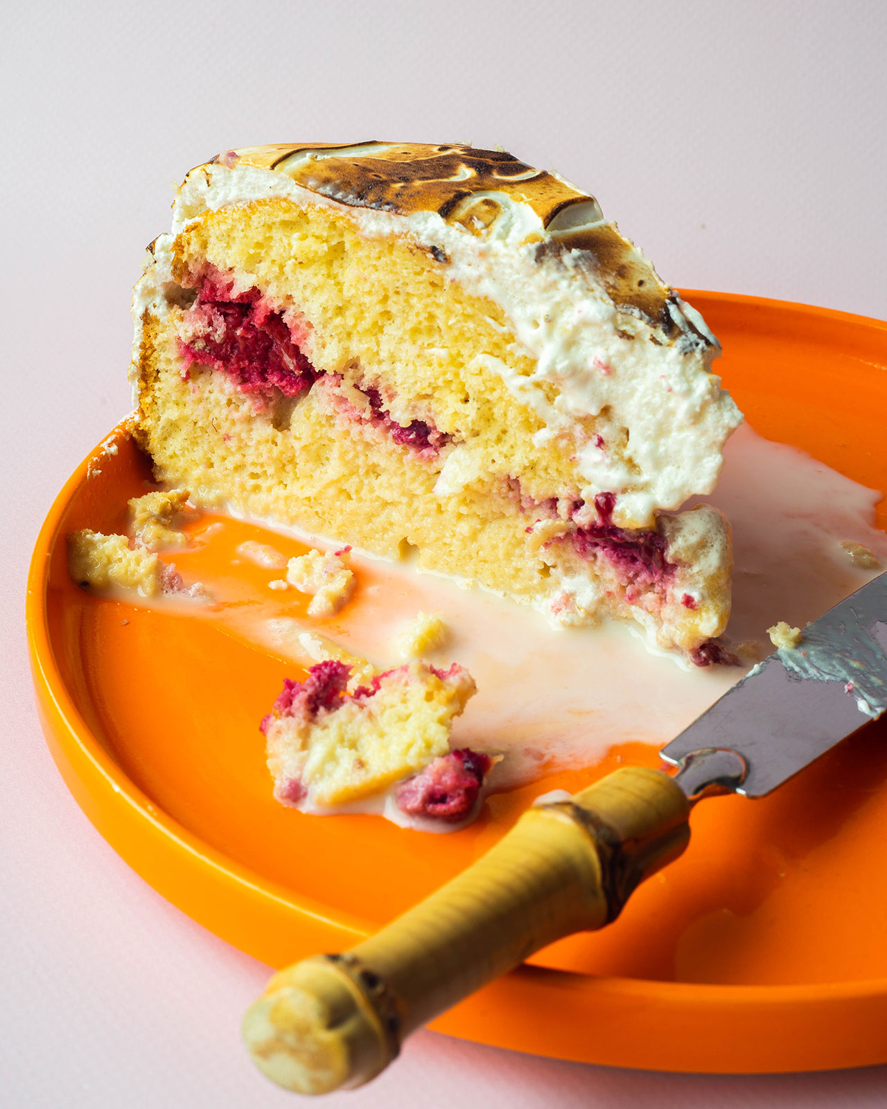 - Use a spatula to cover the cake in whatever look you fancy. slapdash, prim and proper, what have you, and burn the meringue with a blowtorch to your desired level of browning. Dig in.