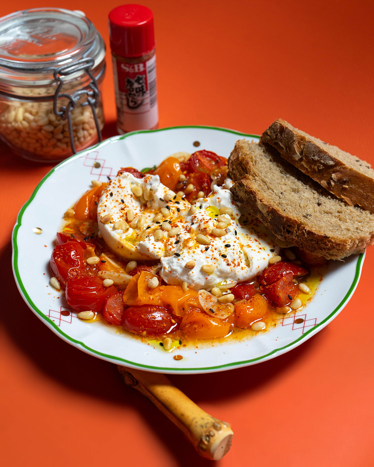 - Place the tomatoes on a large plate, including the juices, and top with either mozzarrella or burrata. Sprinkle over the bread crumbs and some basil leaves, or the pine nuts and some shichimi togarashi to taste, and serve with crusty bread.