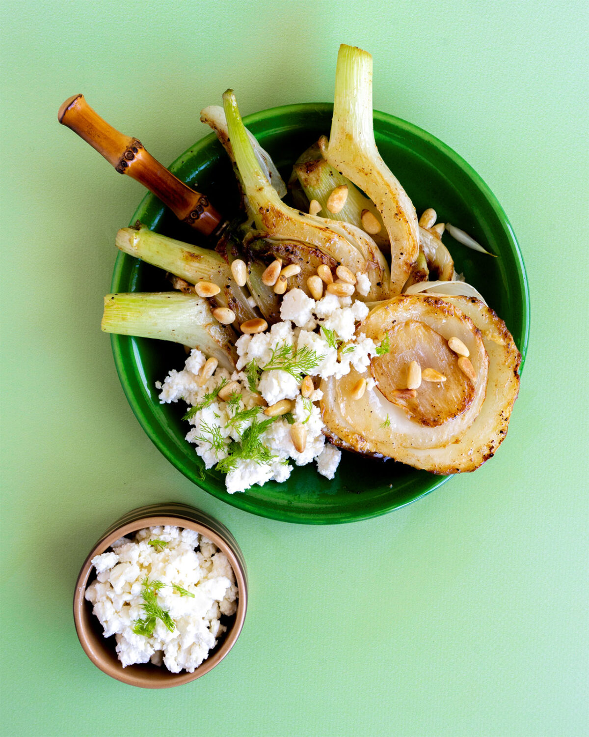 • Depending on the weather and the season, serve immediately or leave until cooled covered in a healthy dose of the crumbled feta, dry roasted pine nuts, chopped fennel fronds and more seasoning to taste.