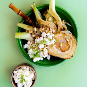 So here’s an old favorite of mine, adapted from a recipe from Yotam Ottolenghi’s Plenty, caramelized fennel with feta and pine nuts.